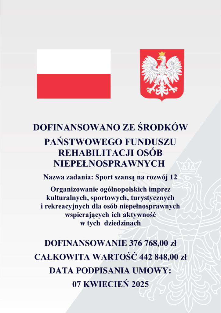 Projekt pn. „Sport szansą na rozwój 11” jest współfinansowany ze środków Państwowego Funduszu Rehabilitacji Osób Niepełnosprawnych w ramach Konkursu nr 1/2024, pn. „Wspieramy aktywność”.